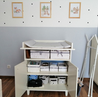 Das Gröbste war geschafft. An die Wand kamen noch passend zum Waldtier-Thema ein paar Bilder von OLGS Babyartikel in Ikea Vankiva Rahmen in 20x30 cm. Die hatte ich schon daheim. Und hier seht ihr auch gleich den Wickelplatz mit den kleinsten Klamotten.